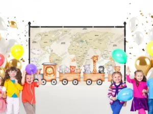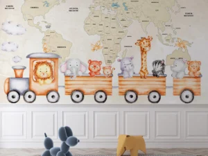 Hayvanlarla Tren Yolculuğu Dünya Haritası Macerası Poster Duvar Kağıdı