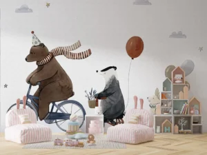 Parti Şapkalı Bisikletli Ayı ve Neşeli Dostlarının Balonlu Yolculuğu Poster Duvar Kağıdı