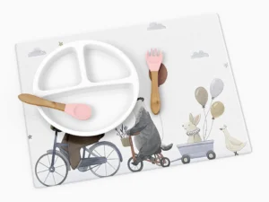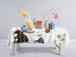 Parti Şapkalı Bisikletli Ayı ve Neşeli Dostlarının Balonlu Yolculuğu Masa Örtüsü
