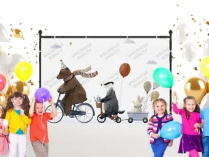 Parti Şapkalı Bisikletli Ayı ve Neşeli Dostlarının Balonlu Yolculuğu Fon Perde