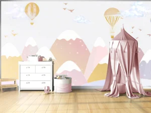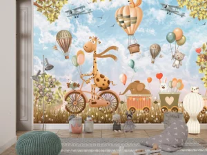 Gökyüzünde Süzülen Balonlar ve Neşeli Dostlarla Dolu Hayaller Diyarı Fon Kumaş