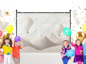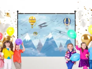 Dağların Üzerinde Balonlar ve Uçaklarla Neşeli Bir Yolculuk Fon Kumaş