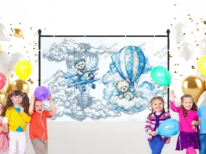 Bulutların Üzerinde Sevimli Ayılarla Rüya Dolu Bir Yolculuk Fon Kumaş