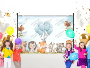 Çayırların Üzerinde Balonlarla Dans Eden Sevimli Orman Dostları Fon Kumaş