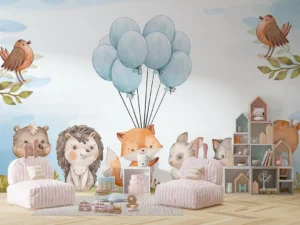 Çayırların Üzerinde Balonlarla Dans Eden Sevimli Orman Dostları Poster Duvar Kağıdı