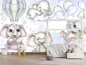 Bulutların Üzerinde Balonlarla Dans Eden Sevimli Yavru Filler Poster Duvar Kağıdı