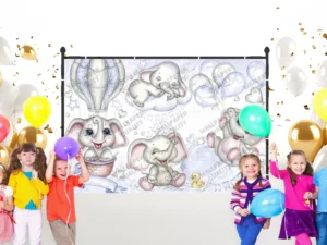 Bulutların Üzerinde Balonlarla Dans Eden Sevimli Yavru Filler Fon Kumaş