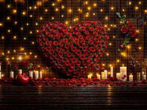 Kırmızı Güllerle Bezeli Kalp Fonu ve Romantik Işıklar Fon Perde
