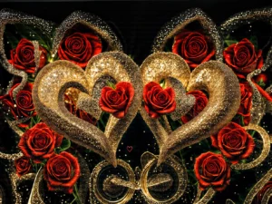 Parıltılı Altın Kalplerin ve Kadifemsi Kırmızı Güllerin Dansı Poster Duvar Kağıdı