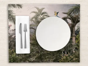Bu tasarım, tropik bir ormanın büyüleyici manzarasını gözler önüne serer. Yemyeşil palmiye ağaçları, egzotik bitkiler ve uçan papağanlar, ormanın zenginliğini ve canlılığını yansıtır. Fırça darbeleri, ormanın dokusunu, renklerin derinliğini ...