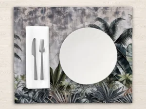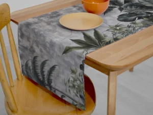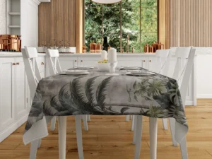 Koyu Yeşil ve Gri Tonlarıyla Tropik Yaprakların Gizemli Dokunuşu Masa Örtüsü