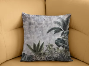 Koyu Yeşil ve Gri Tonlarıyla Tropik Yaprakların Gizemli Dokunuşu Kırlent
