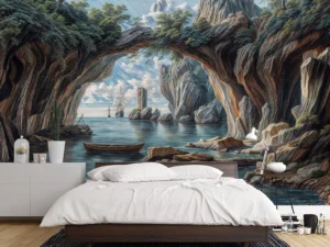 Gizemli Mağara Geçidinden Süzülen Işığın Altında Sakin Bir Keşif Fon Kumaş