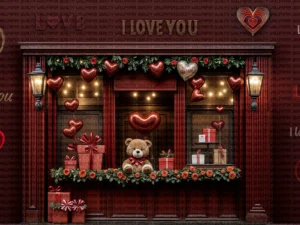 Bu tasarım, aşkın ve romantizmin en tatlı halini, adeta bir rüyadan fırlamış gibi gözler önüne seriyor. Derin bordo ve kırmızı tonlarındaki bir mağaza vitrini, sevginin ve kutlamanın sıcaklığını simgeliyor. ...