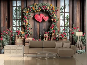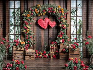 Bu tasarım, doğanın sıcaklığı ile aşkın samimiyetini büyüleyici bir şekilde bir araya getiriyor. Rustik ahşap bir kulübenin önünde yükselen, kırmızı ve turuncu tonlarındaki güllerle özenle bezenmiş kalp şeklinde bir ...