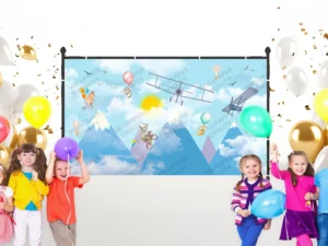 Gökyüzünde Uçan Balonlar ve Uçaklarla Neşeli Ayılar Diyarı Fon Kumaş