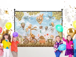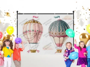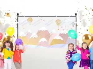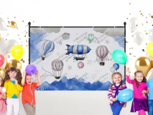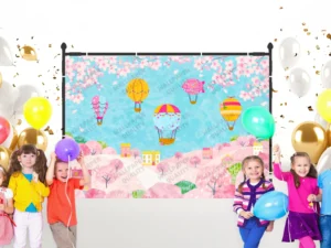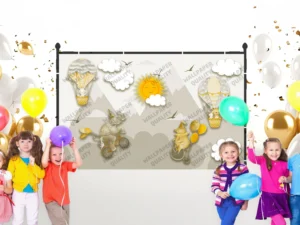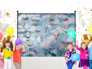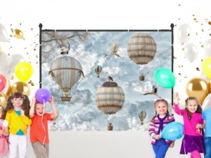 Gökyüzünde Süzülen Balonlar ve Neşeli Dostlarla Dolu Hayaller Diyarı Fon Kumaş