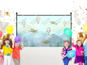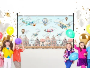 Gökyüzünde Uçak ve Balonlarla Hayal Dolu Bir Macera Fon Kumaş