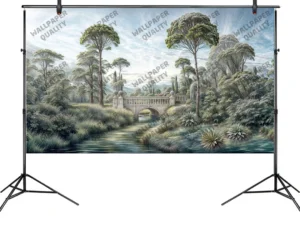 Çam ve Selvi Ağaçlarının Gölgesinde Yükselen Antik Köprü Fon Kumaş