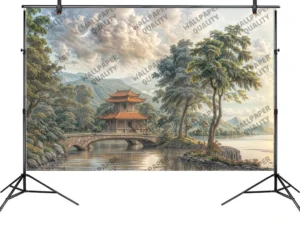 Antik Köprülerin Üzerinde Yükselen Tapınak Manzarası Fon Kumaş