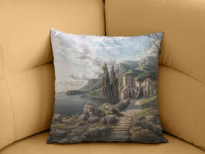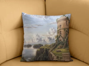Sonsuz Maviliklere Uzanan Deniz ve Yamaçta Yükselen Antik Kule Kırlent