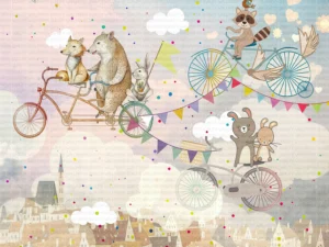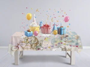Ayı Tilki ve Tavşanların Bulutların Üzerinde Bisiklet Keyfi Masa Örtüsü