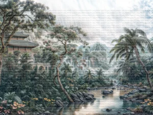 Asya Ormanlarının Gizemli Kalbinden Yükselen Antik Tapınaklar Masa Örtüsü