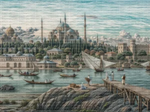 Camii’nin Görkemli Silüeti Dalgalanan Denizde Süzülen Saltanat Kayıkları Masa Örtüsü