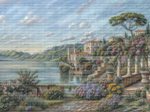 Çiçek Açan Kıyılarıyla Como Gölü’nün Tarihi Villalarının Gölgesi Masa Örtüsü