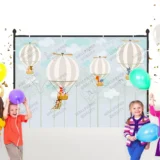 Bu tasarım, hayal gücünün sınırlarını zorlayan sevimli bir sahne sunuyor. Balonlar, ağaçların üzerinde neşeyle süzülürken, minik yolcularını da yanlarında taşıyor. Pastel renkler ve yumuşak dokular, huzurlu ve davetkar bir atmosfer yaratırken, detaylı çizimler de merak uyandırıyor. Bu görsel, çocukların hayal dünyasına bir kapı aralıyor, onları tatlı bir serüvene davet ediyor.