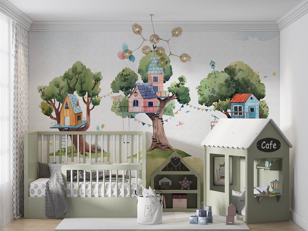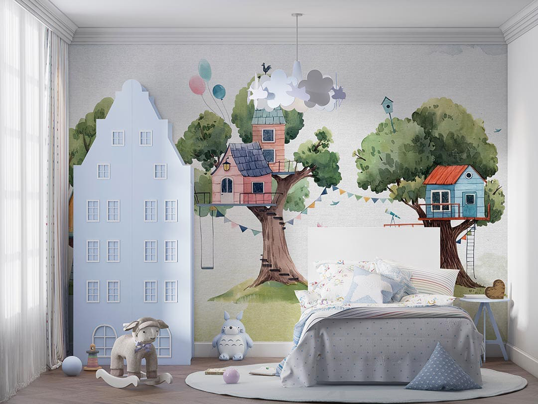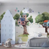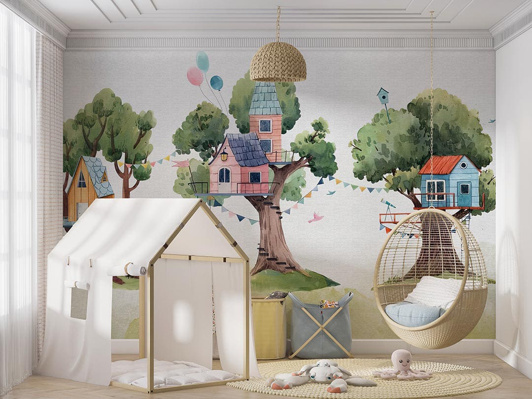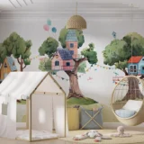 Bu tasarım, yemyeşil ağaçların dallarına kurulmuş rengarenk evlerle dolu büyülü bir dünyayı betimliyor. Her bir ağaç ev, çocuksu hayallerin ve neşenin bir yansıması olarak karşımıza çıkıyor. Pastel tonlardaki renkler ve sevimli detaylar, izleyicisine huzurlu ve keyifli bir atmosfer sunarken, ağaçlardaki salıncaklar ve balonlar, hayal gücünün sınırlarını zorlayan bir maceraya davet ediyor. Bu görsel, doğayla iç içe olmanın ve çocuksu neşeyi yaşamanın önemini vurguluyor.