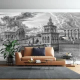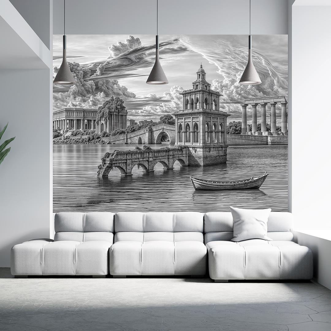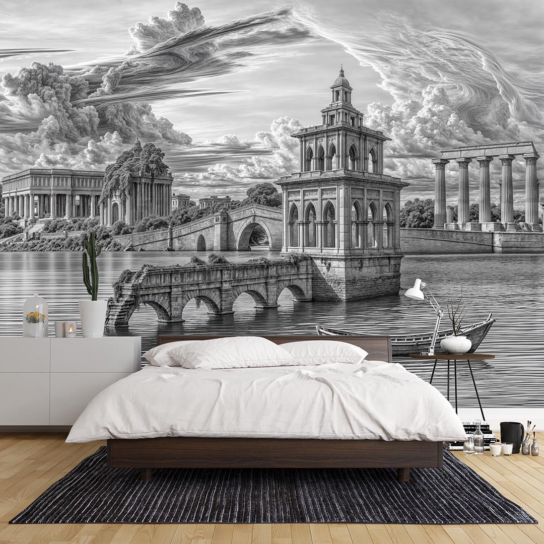 Bu tasarım, antik bir su yolu üzerinde yükselen klasik mimarinin büyüleyici ve dramatik atmosferini fırça darbeleriyle gözler önüne seriyor. Yıkık köprüler ve suya batmış yapılar, zamanın yıkıcı gücünü ve geçmişin ihtişamını fısıldıyor. Arka plandaki görkemli binalar ve sütunlar, bir zamanlar var olan büyük bir medeniyetin izlerini taşıyor. Her fırça darbesi, taşın dokusunu, suyun dalgalanmasını ve gökyüzünün dramatik bulutlarını vurgularken, grinin, siyahın ve beyazın tonları, bu sahnenin derinliğini ve melankolisini hissettiriyor. İzleyicide bir hayranlık, hüzün ve keşfetme arzusu uyandırırken, aynı zamanda tarihin ve doğanın gücüne tanık olma hissini veriyor. Bu görsel, ruhu dinlendiren, hayal gücünü harekete geçiren ve sizi zamansız bir yolculuğa davet eden bir kapı aralıyor.