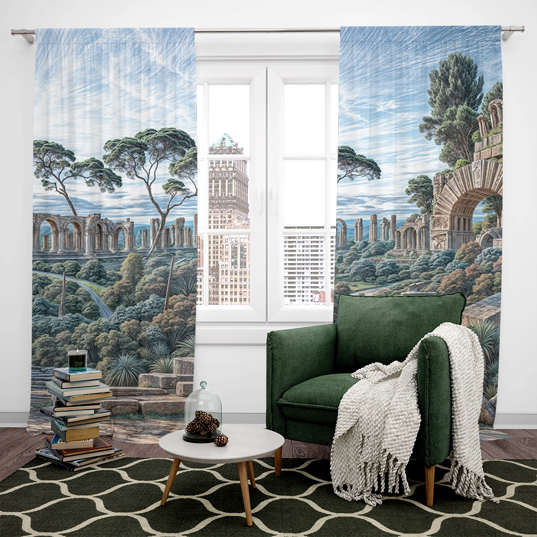 Bu tasarım, Antik Yunan medeniyetinin yitik ihtişamını, doğanın zamanla olan kucaklaşmasını fırça darbeleriyle gözler önüne seriyor. Yemyeşil tepeler ve ağaçlar arasında yükselen kadim sütunlar ve harabeler, geçmişin büyüleyici hikayelerini fısıldıyor. Her fırça darbesi, taşın yıpranmış dokusunu, bitki örtüsünün canlılığını ve gökyüzünün sonsuzluğunu vurgularken, yeşilin, bejin ve mavinin zengin tonları, bu antik dünyanın dinginliğini ve gizemini hissettiriyor. İzleyicide bir hayranlık, saygı ve keşfetme arzusu uyandırırken, aynı zamanda tarihin derinliklerine bir yolculuk yapma hissini veriyor. Bu görsel, ruhu dinlendiren, hayal gücünü harekete geçiren ve sizi kadim bir medeniyetin kalbine davet eden bir kapı aralıyor.