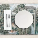Bu tasarım, Arthur Byrne’ın egzotik ve huzur dolu manzaralarını yansıtan, antik sütunların, şelalelerin ve tropik bitki örtüsünün büyüleyici atmosferini fırça darbeleriyle gözler önüne seriyor. Yüksek palmiyeler ve çeşitli yeşil bitkiler, manzaraya derinlik ve doğal bir ihtişam katarken, basamaklı şelaleler ve dingin göl, mekana hayat ve sakinlik katıyor. Her fırça darbesi, taşın dokusunu, suyun akışını ve bitki örtüsünün canlılığını vurgularken, yeşilin, bejin ve mavinin zengin tonları, bu sahnenin huzurunu ve büyüsünü hissettiriyor. İzleyicide bir hayranlık, dinginlik ve keşfetme arzusu uyandırırken, aynı zamanda kaybolmuş bir cennetin veya rüyanın parçası olma hissini veriyor. Bu görsel, ruhu dinlendiren, hayal gücünü harekete geçiren ve sizi egzotik bir yolculuğa davet eden bir kapı aralıyor.