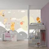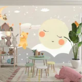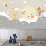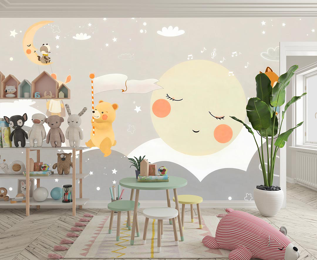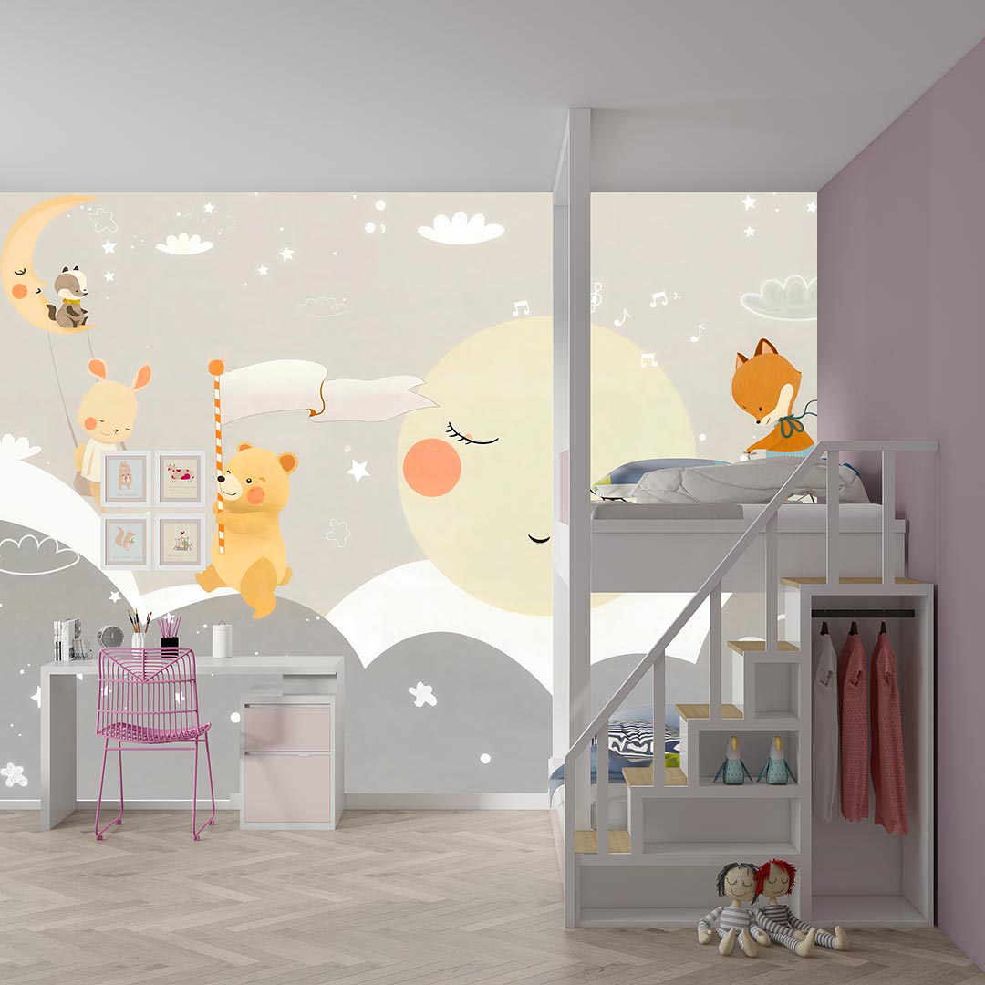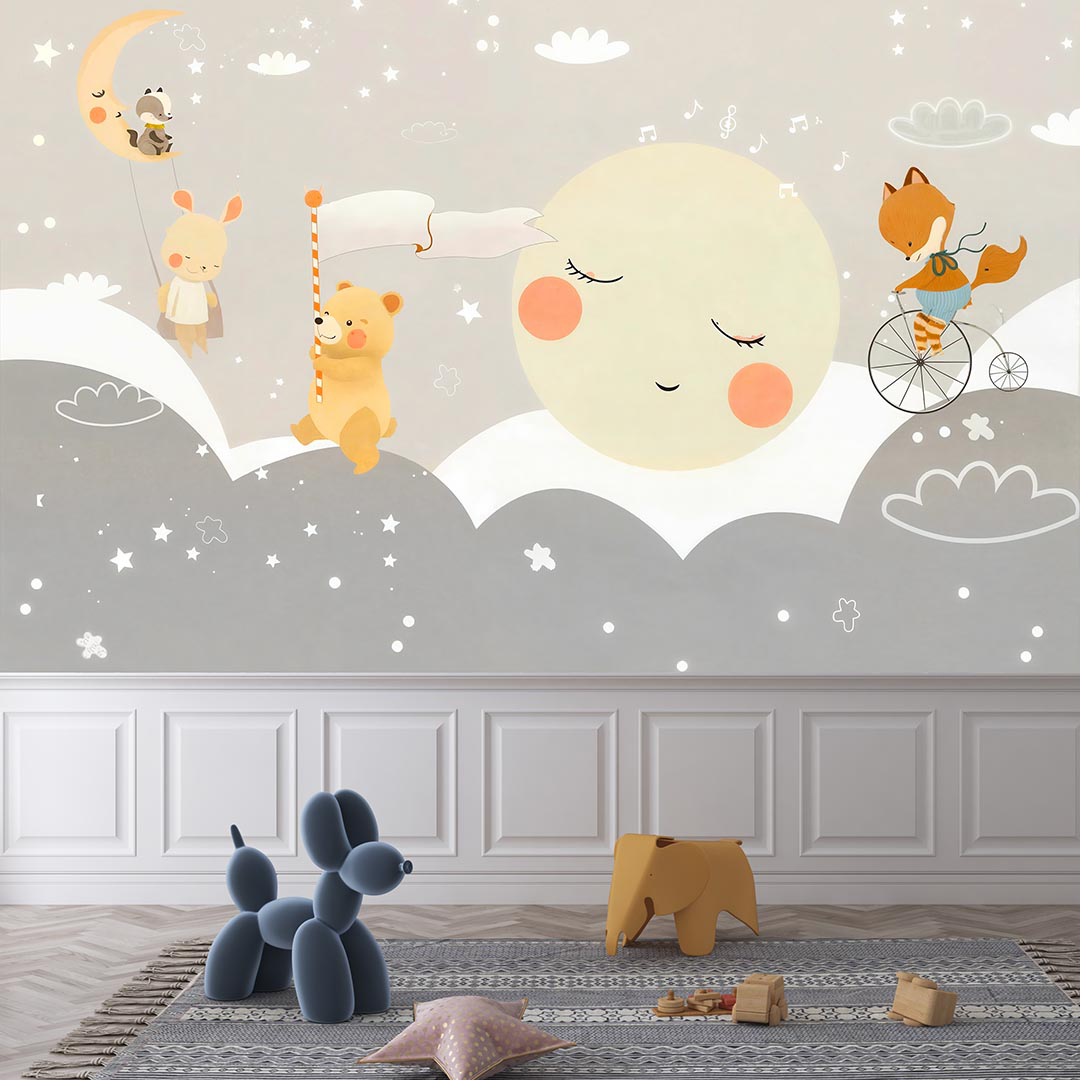 Bu tasarım, ay ışığının aydınlattığı bulutlu bir gökyüzünün altında, sevimli ayıların ve neşeli tilkilerin yer aldığı masalsı bir gece sahnesini betimler. Sulu boyanın yumuşak dokusu ve pastel tonlardaki renk paleti, görselin dingin ve huzurlu atmosferini oluşturur. Ayın üzerinde oturan rakun ve tavşan figürleri, görselin rüya gibi ve fantastik atmosferini güçlendirir. Bayrak tutan ayı ve bisiklete binen tilki gibi detaylar, görselin oyunbaz ve neşeli karakterini vurgular. Bu görsel, çocuk odalarına veya yaşam alanlarına huzur, neşe ve hayal gücü katmak için idealdir.