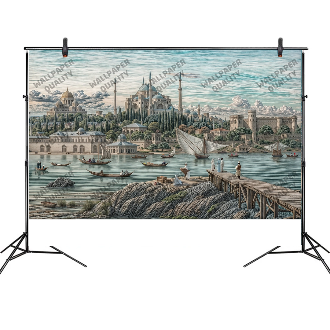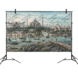 Bu tasarım, 16. yüzyıl İstanbul’unun görkemli ve tarihi atmosferini, fırça darbeleriyle gözler önüne seriyor. Haliç’in sakin sularında yüzen geleneksel tekneler ve uzakta yükselen Ayasofya gibi ikonik yapılar, şehrin kadim ruhunu ve Osmanlı İmparatorluğu’nun altın çağını fısıldıyor. Sahildeki insanlar ve ahşap iskele, manzaraya canlılık ve günlük yaşamdan bir kesit katarken, gökyüzündeki bulutlar, mekana dramatik ve büyülü bir hava katıyor. Her fırça darbesi, suyun yansımalarını, binaların detaylarını ve ışığın oyununu vurgularken, grinin, bejin ve mavinin zengin tonları, bu sahnenin huzurunu ve büyüsünü hissettiriyor. İzleyicide bir hayranlık, saygı ve geçmişe duyulan özlem arzusu uyandırırken, aynı zamanda tarihin ve sanatın eşsiz birleşimine tanık olma hissini veriyor. Bu görsel, ruhu dinlendiren, hayal gücünü harekete geçiren ve sizi zamansız bir yolculuğa davet eden bir kapı aralıyor.