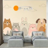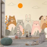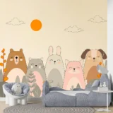 Bu tasarım, ormanın kenarında bir araya gelmiş sevimli hayvan dostlarının mutluluğunu yansıtıyor. Ayıcık, kedi, tavşan, tilki ve köpek, güneşin altında, bitkilerin arasında neşeyle duruyorlar. Fırça darbeleri, hayvanların yumuşaklığını ve doğanın sakinliğini hissettiriyor. Pastel ve doğal renkler, huzurlu bir atmosfer yaratırken, hayvanların gülümseyen yüzleri dostluğun ve mutluluğun mesajını veriyor. Bu görsel, izleyicide sıcaklık, neşe ve sevgi hissi uyandırarak mekanlara pozitif bir enerji katmayı amaçlıyor.