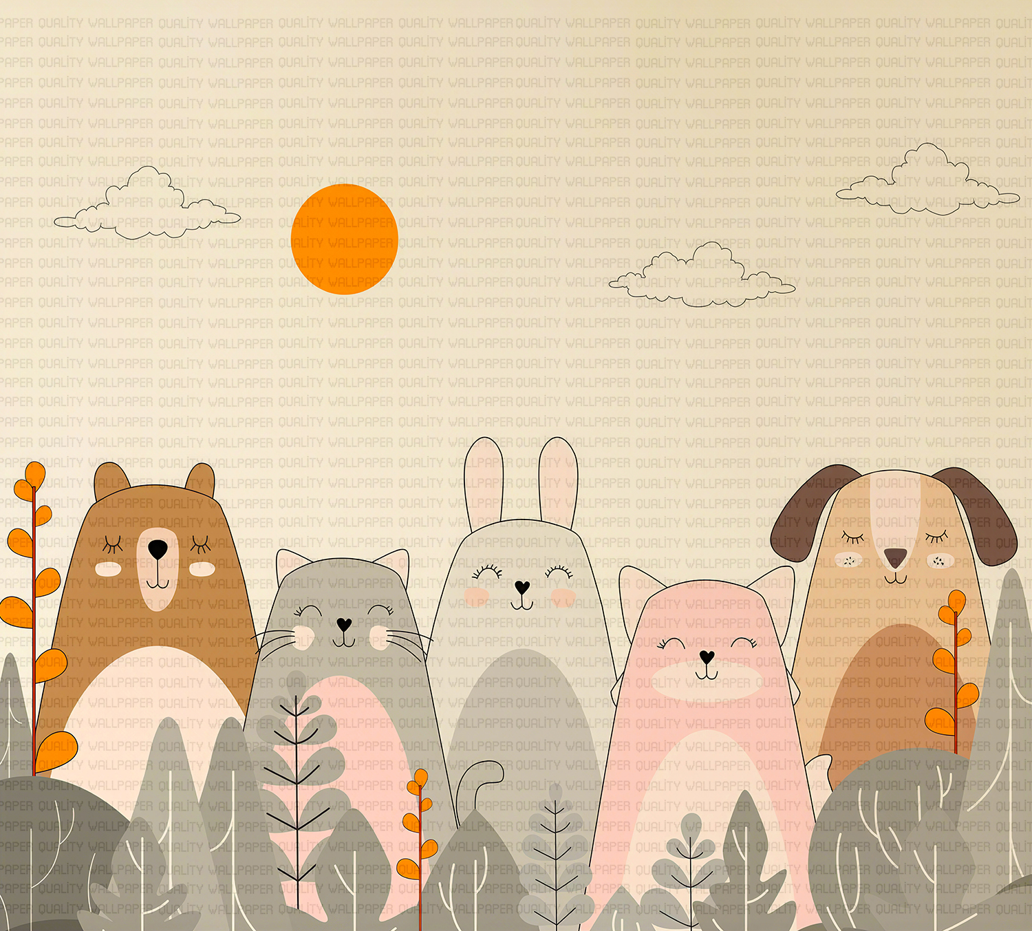 Bu tasarım, ormanın kenarında bir araya gelmiş sevimli hayvan dostlarının mutluluğunu yansıtıyor. Ayıcık, kedi, tavşan, tilki ve köpek, güneşin altında, bitkilerin arasında neşeyle duruyorlar. Fırça darbeleri, hayvanların yumuşaklığını ve doğanın sakinliğini hissettiriyor. Pastel ve doğal renkler, huzurlu bir atmosfer yaratırken, hayvanların gülümseyen yüzleri dostluğun ve mutluluğun mesajını veriyor. Bu görsel, izleyicide sıcaklık, neşe ve sevgi hissi uyandırarak mekanlara pozitif bir enerji katmayı amaçlıyor.