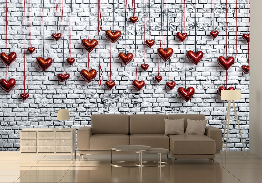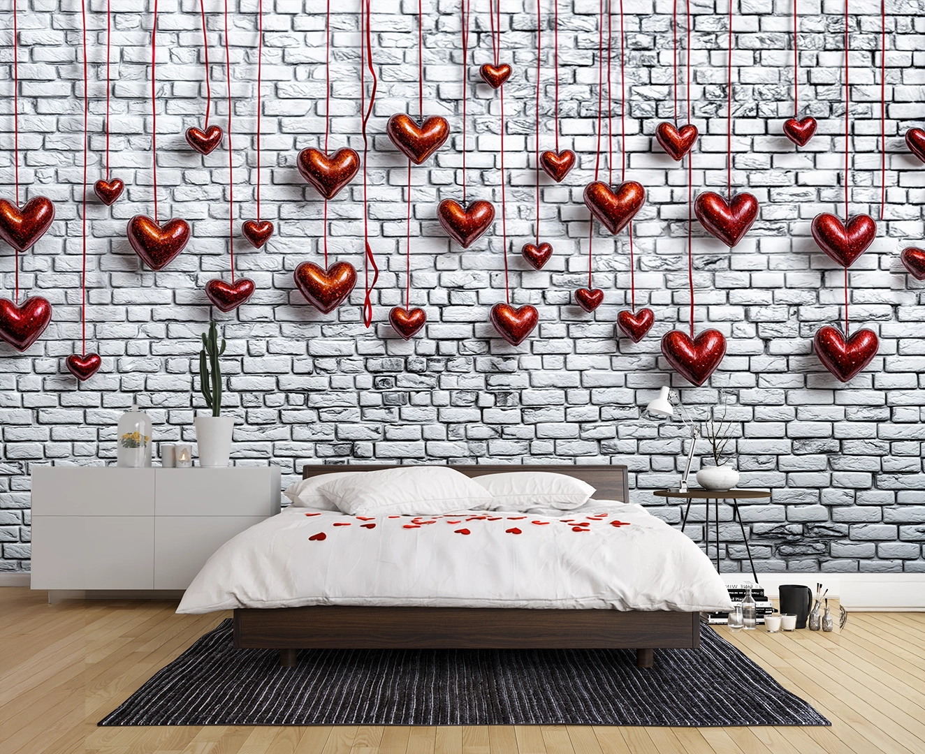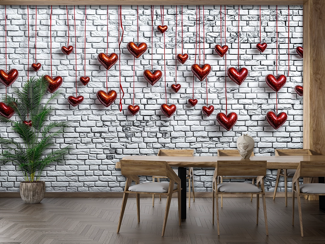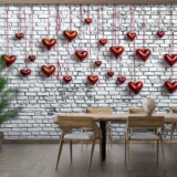 Bu tasarım, aşkın ve romantizmin en saf ve en tutkulu halini gözler önüne seriyor. Beyaz tuğla duvarın modern ve minimalist dokusu üzerinde, farklı boyutlarda ve parlaklıkta binlerce kırmızı kalp, sevginin gücünü ve derinliğini simgeliyor. Kalplerin ince kırmızı iplerle asılı durması, adeta havada süzülen bir aşk fısıltısı gibi, her bir anın özel olduğunu vurguluyor. Işıkların kalpler üzerindeki yansıması, bu özel anın ışıltısını ve büyüsünü artırıyor. Bu eser, izleyicide sıcaklık, huzur ve derin bir romantizm hissi uyandırır. Sevgililer Günü, evlilik teklifi, düğün veya özel yıldönümleri gibi unutulmaz anları ölümsüzleştirmek için tasarlanmıştır.