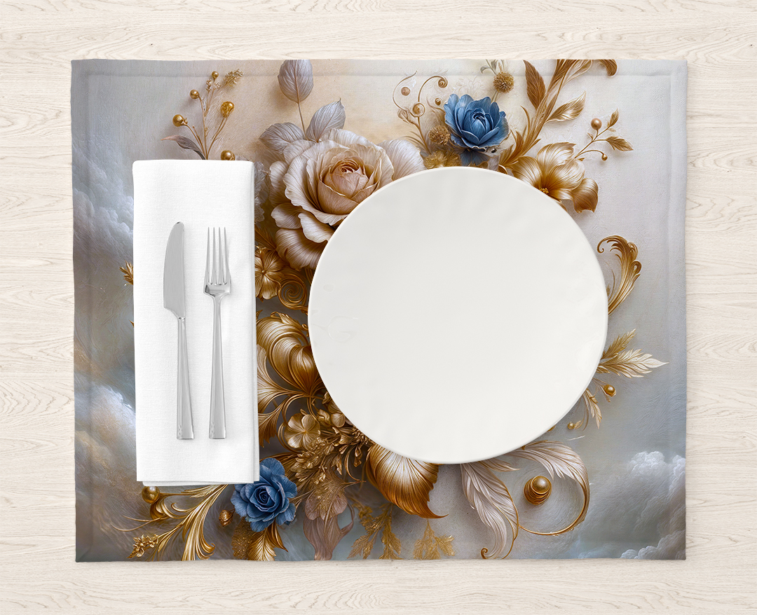 Bu büyüleyici tasarım, beyaz ve mavi güllerin zarafetini altın detayların lüks dokunuşuyla bir araya getirerek mekanlara sofistike bir hava katıyor. Her bir çiçek ve yaprak, özenle işlenmiş altın süslemelerle zenginleştirilerek göz alıcı bir etki yaratıyor. Bu özel tasarım, klasik ve modern estetiği harmanlayarak izleyicisine lüks ve zarif bir deneyim sunuyor.