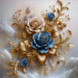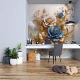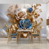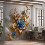 Bu büyüleyici tasarım, beyaz ve mavi güllerin zarafetini altın detayların lüks dokunuşuyla bir araya getirerek mekanlara sofistike bir hava katıyor. Her bir çiçek ve yaprak, özenle işlenmiş altın süslemelerle zenginleştirilerek göz alıcı bir etki yaratıyor. Bu özel tasarım, klasik ve modern estetiği harmanlayarak izleyicisine lüks ve zarif bir deneyim sunuyor.