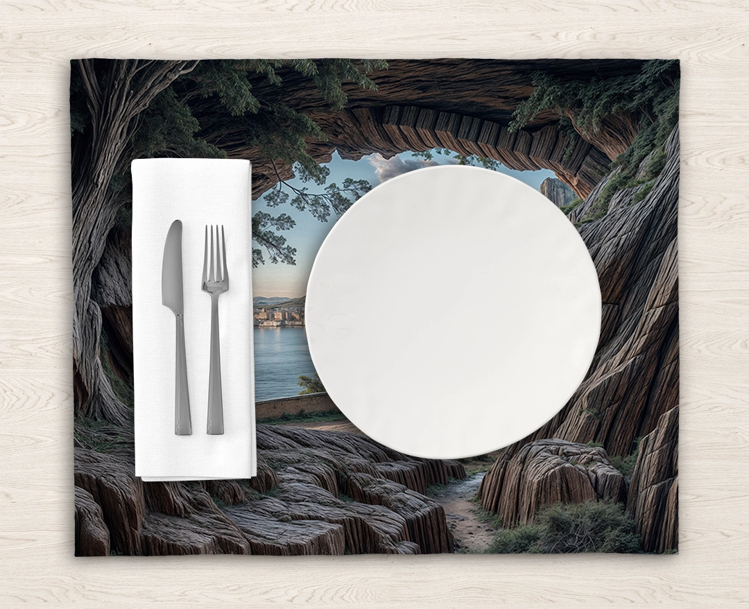 Bu tasarım, William Shakespeare’in “Bir Yaz Gecesi Rüyası” adlı eserinden ilham alan, gizemli bir geçidin ve dingin bir göl manzarasının büyüleyici atmosferini fırça darbeleriyle gözler önüne seriyor. Kadim ağaçların ve devasa taş oluşumlarının oluşturduğu doğal kemer, izleyiciyi bilinmeyene doğru bir yolculuğa davet ederken, uzakta parıldayan göl ve dağlar, manzaraya derinlik ve doğal bir ihtişam katıyor. Her fırça darbesi, ağaçların ve taşların dokusunu, suyun dinginliğini ve ışığın gölgelerle olan oyununu vurgularken, yeşilin, kahverenginin ve mavinin zengin tonları, bu sahnenin huzurunu ve büyüsünü hissettiriyor. İzleyicide bir hayranlık, sakinlik ve keşfetme arzusu uyandırırken, aynı zamanda fantastik bir dünyanın kapılarını aralama hissini veriyor. Bu görsel, ruhu dinlendiren, hayal gücünü harekete geçiren ve sizi zamansız bir masalın içine davet eden bir kapı aralıyor.