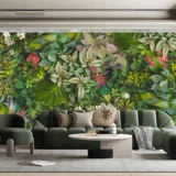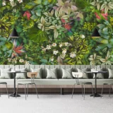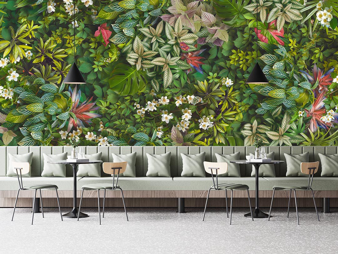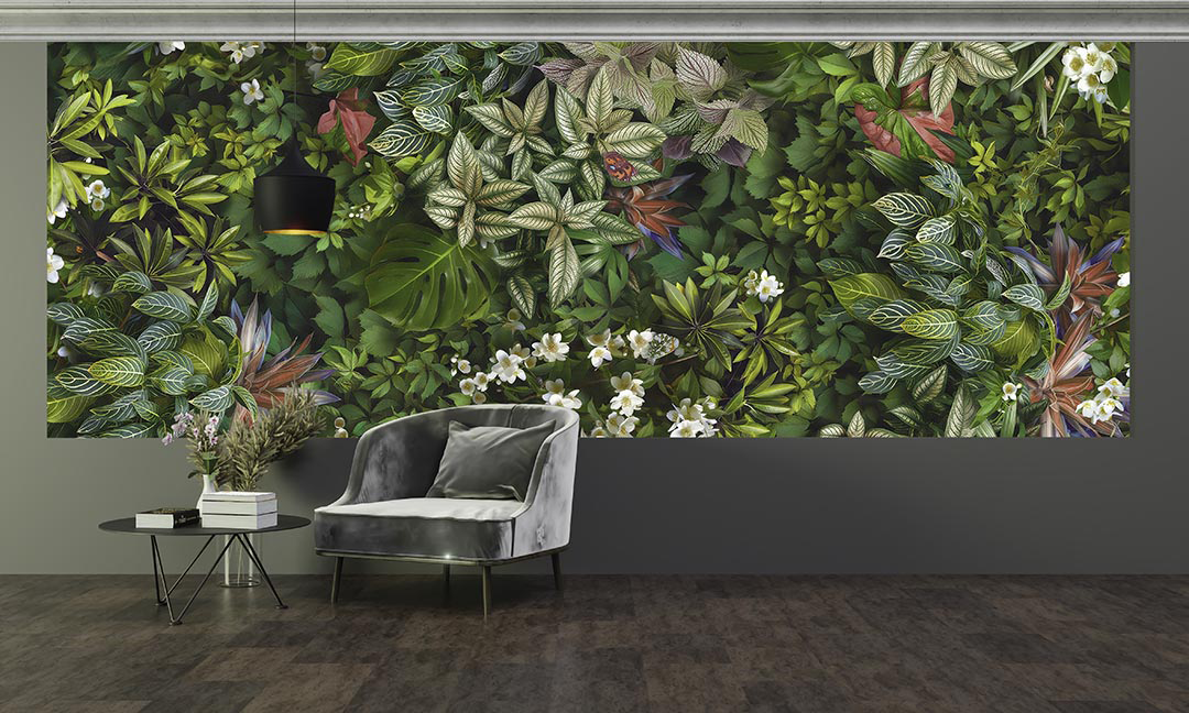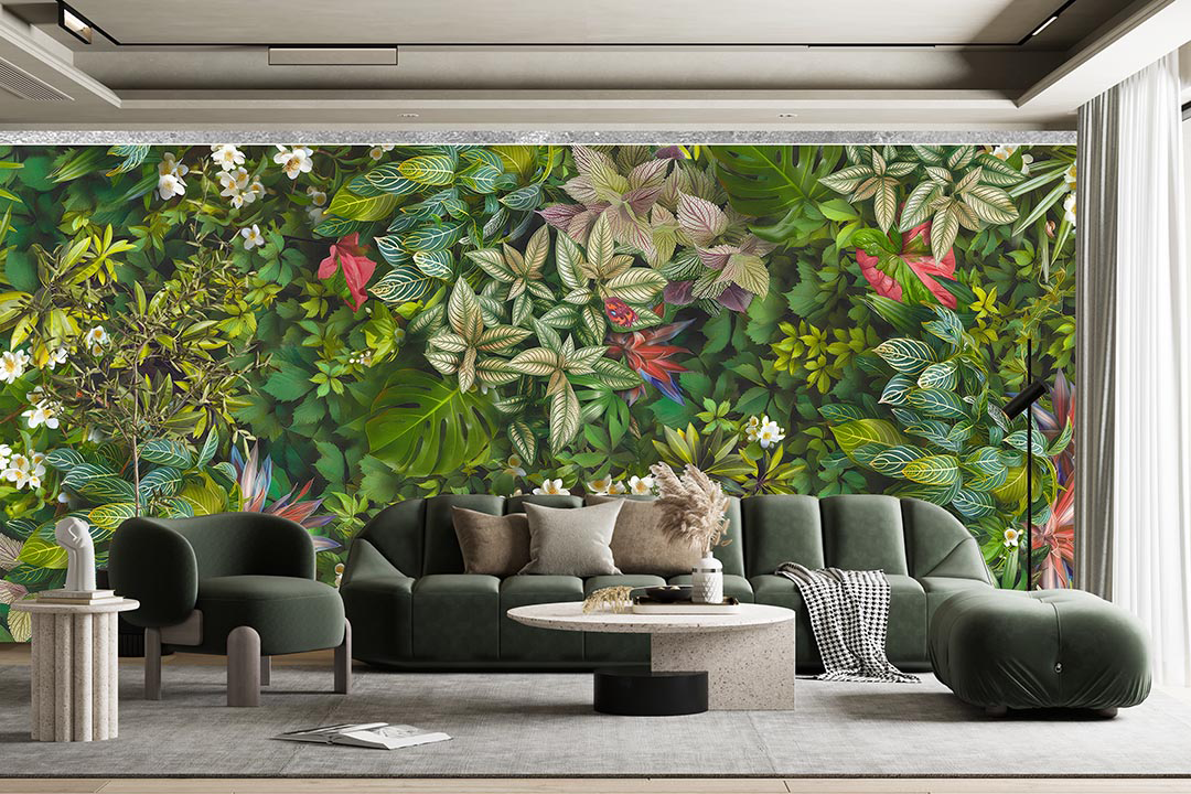Bu tasarım, tropikal yaprakların canlı renklerini ve zengin dokularını bir araya getirerek doğanın enerjisini ve dinamizmini yansıtıyor. Yaprakların hareketli kompozisyonu ve canlı renkleri, mekanlara tropikal bir esinti ve ferahlık katıyor. Bu eser, doğanın canlılığını ve enerjisini iç mekanlara taşıyarak izleyicilere ilham veriyor.