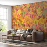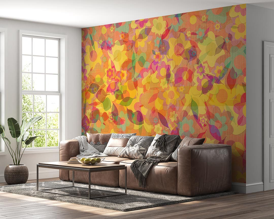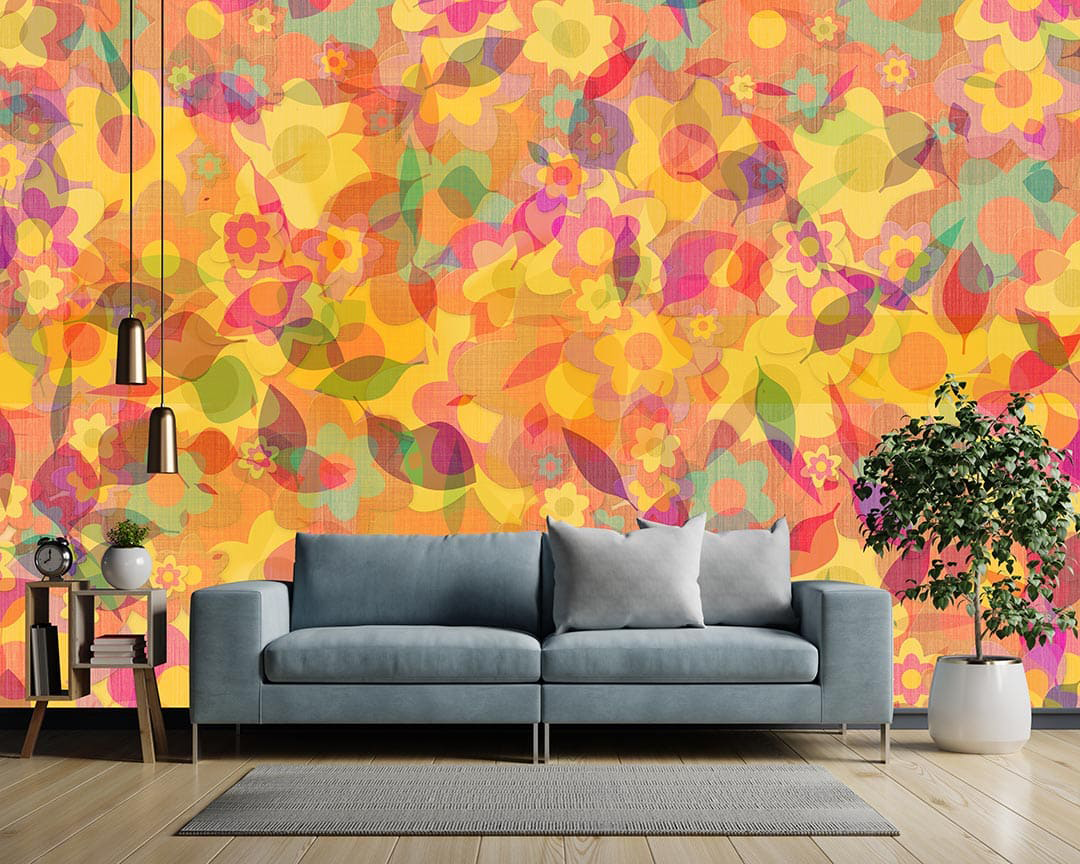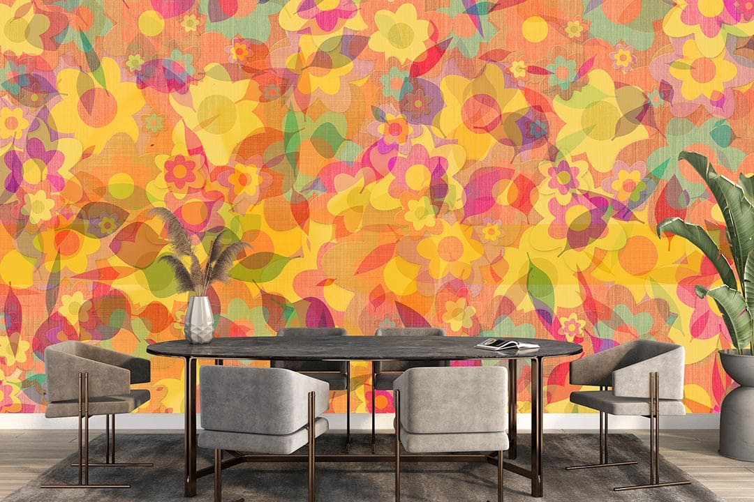 Bu tasarım, baharın canlılığını ve enerjisini yansıtan renklerle dolu bir görsel şölen sunuyor. Sarı, turuncu, pembe ve mor tonlarının bir araya geldiği bu kompozisyon, neşe ve canlılık hissi uyandırıyor. Çiçeklerin ve yaprakların dinamik düzeni, tasarıma hareket ve derinlik katarken, izleyiciye pozitif bir enerji veriyor. Bu çalışma, mekanlara baharın tazeliğini ve coşkusunu taşımak için tasarlandı.