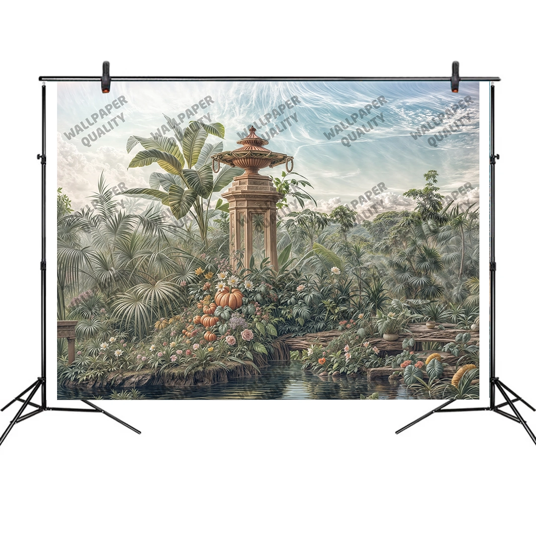 Bu tasarım, egzotik bir rüya bahçesinin derinliklerinde gizlenmiş, mistik bir kule ve yemyeşil bitki örtüsünün büyüleyici atmosferini fırça darbeleriyle gözler önüne seriyor. Yüksek kule, geçmişin sırlarını fısıldarken, çevresindeki rengarenk çiçekler, kabaklar ve tropik bitkiler, manzaraya canlılık ve doğal bir ihtişam katıyor. Akan suyun dinginliği ve gökyüzünün hafif bulutlu, pastel tonları, izleyicide bir rüya aleminin veya dingin bir anın hissini uyandırıyor. Her fırça darbesi, bitkilerin narin dokusunu, suyun sakinliğini ve kulenin detaylarını vurgularken, yeşilin, turuncunun, pembenin ve mavinin zengin tonları, bu sahnenin huzurunu ve büyüsünü hissettiriyor. Bu görsel, ruhu dinlendiren, hayal gücünü harekete geçiren ve sizi egzotik bir yolculuğa davet eden bir kapı aralıyor.