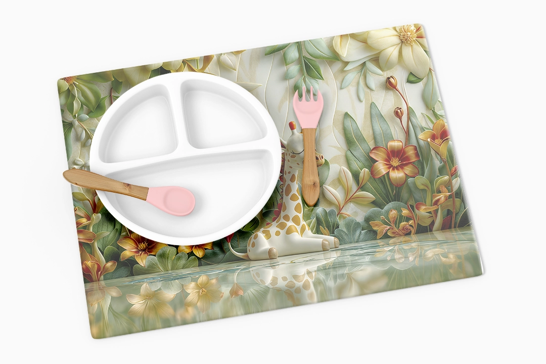 Bu büyüleyici tasarım, izleyiciyi yemyeşil bir bahçeye davet ediyor. Zarif zürafa, rengarenk çiçekler ve bitkilerle çevrili huzurlu bir yolculuğa çıkıyor. Fırça darbeleri, bahçenin canlılığını ve dokusunu hissettirirken, renkler ise doğanın zenginliğini ve neşesini yansıtıyor. Bu eser, doğanın güzelliğine ve uyumuna bir övgü niteliği taşıyor.