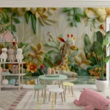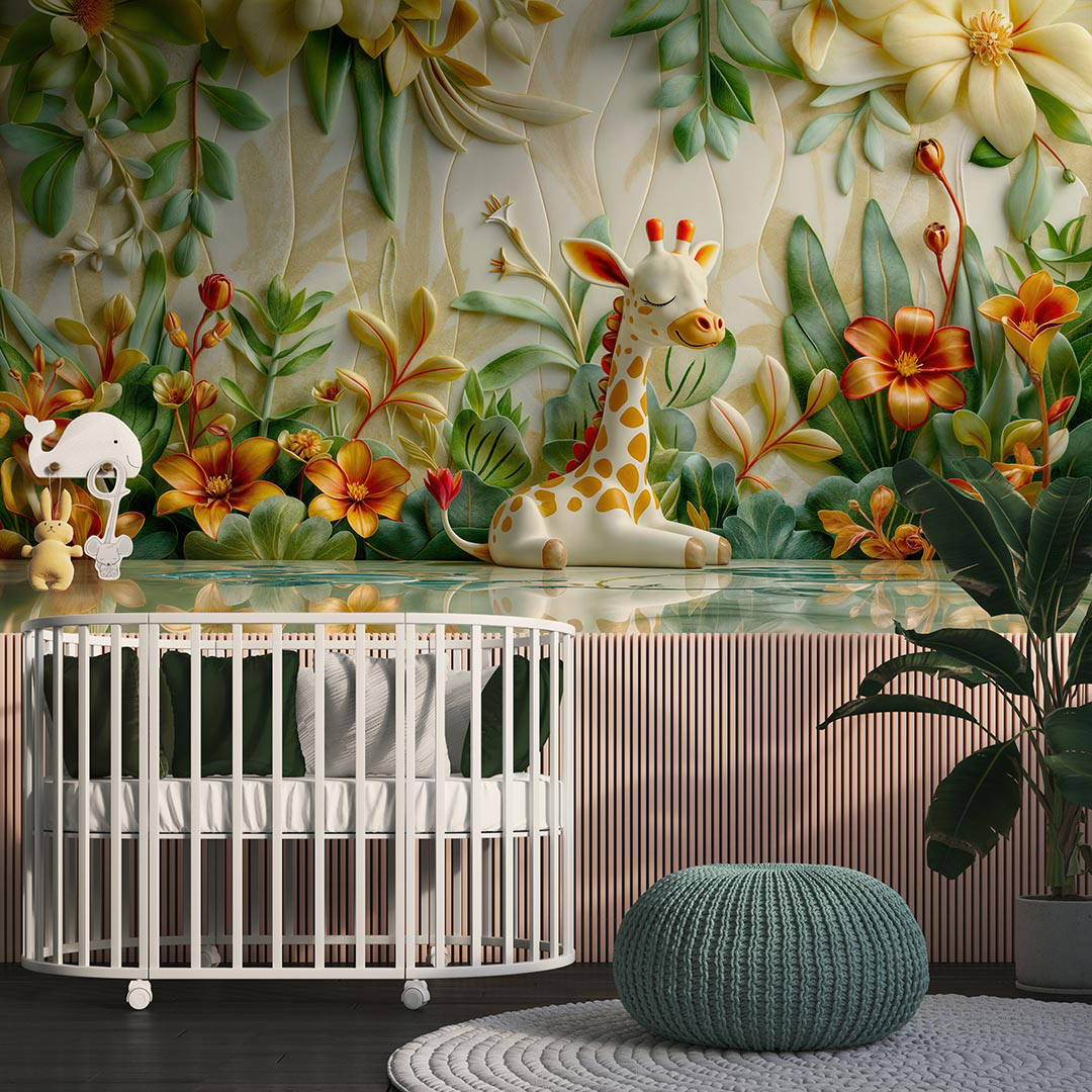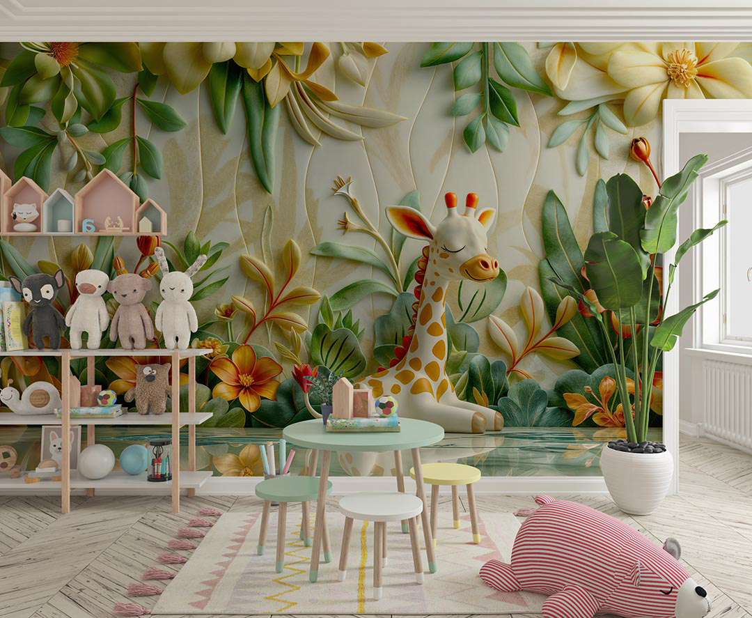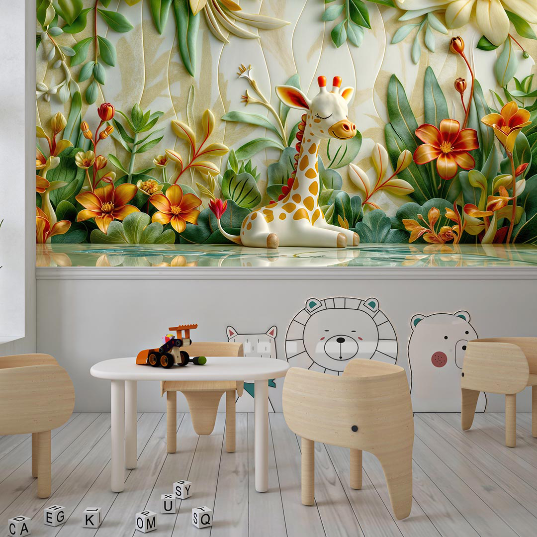 Bu büyüleyici tasarım, izleyiciyi yemyeşil bir bahçeye davet ediyor. Zarif zürafa, rengarenk çiçekler ve bitkilerle çevrili huzurlu bir yolculuğa çıkıyor. Fırça darbeleri, bahçenin canlılığını ve dokusunu hissettirirken, renkler ise doğanın zenginliğini ve neşesini yansıtıyor. Bu eser, doğanın güzelliğine ve uyumuna bir övgü niteliği taşıyor.