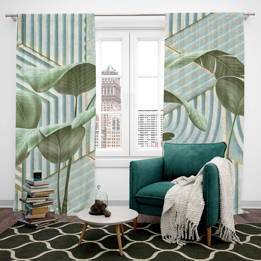Bu tasarım, tropik yaprakların doğal güzelliğini geometrik desenlerin düzeniyle birleştirerek ortaya çıkan sofistike ve modern bir estetiği yansıtıyor. Yaprakların kıvrımlı hatları ve organik dokusu, geometrik şekillerin keskin çizgileriyle kontrast oluşturarak hem doğanın canlılığını hem de modern tasarımın zarafetini bir araya getiriyor. Bu eser, mekanlara dengeli ve büyüleyici bir atmosfer katıyor.