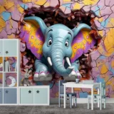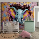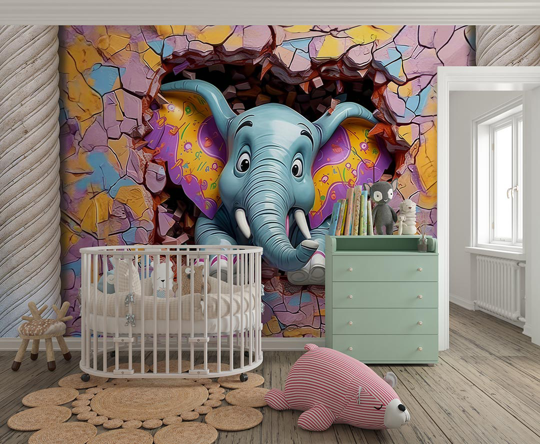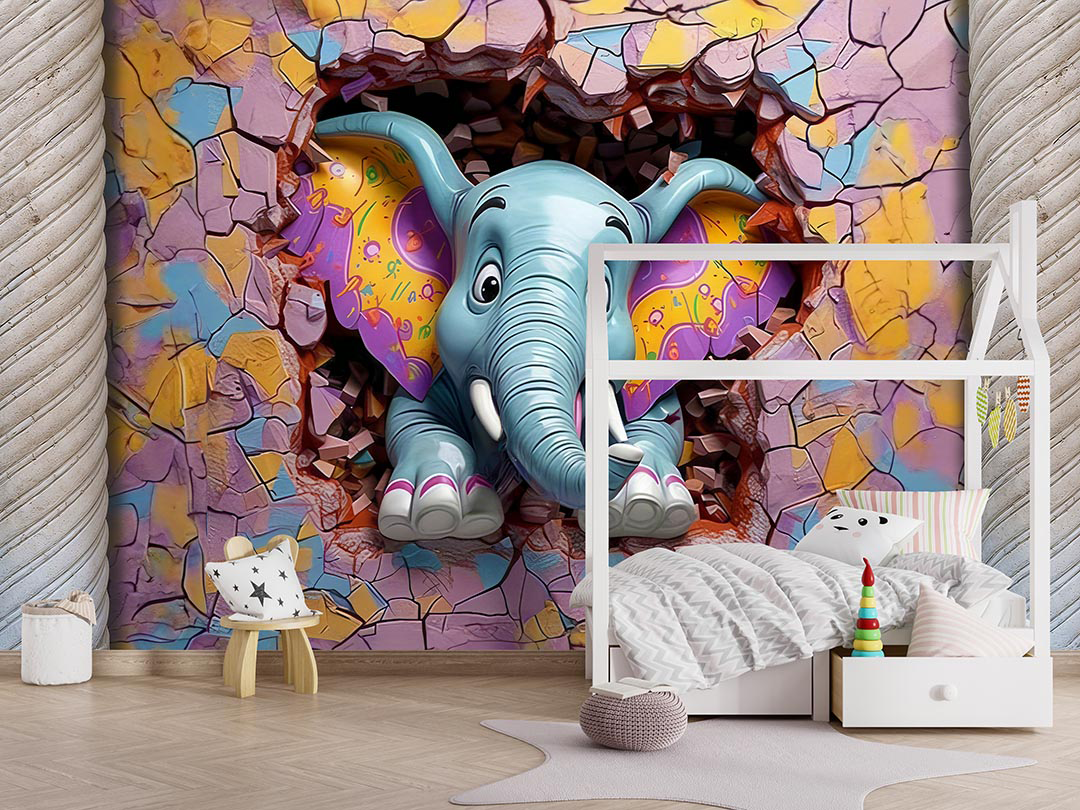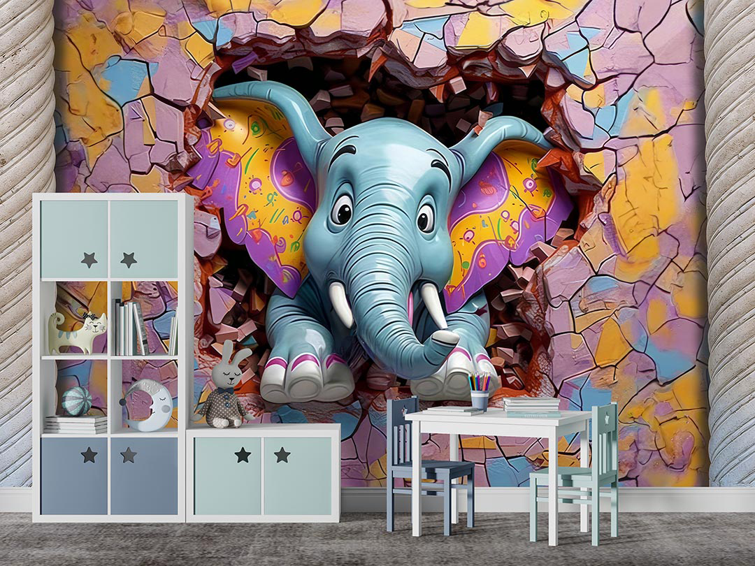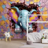 Bu büyüleyici tasarım, duvarı aşarak izleyicilere neşeyle bakan renkli bir fili betimliyor. Filin canlı renkleri ve sevimli ifadesi, izleyicilere keyifli ve eğlenceli bir an sunuyor. Fırça darbeleri, filin dokusunu ve duvarın hareketli yapısını vurgularken, renkler ortama enerji ve canlılık katıyor. Bu eser, hayal gücünün sınırlarını zorlayan neşeli bir sahne sunarak izleyicilere mutluluk dolu bir deneyim yaşatıyor.