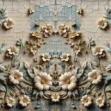 Bu sanat eseri, geçmişin izlerini taşıyan eskitilmiş bir dokunun üzerinde yükselen çiçeklerin zamansız güzelliğini gözler önüne seriyor. Kabartmalı detaylar, çiçeklere boyut ve derinlik kazandırarak onlara adeta bir heykelsi zarafet katıyor. Bu eser, mekanlara hem nostaljik bir hava hem de sofistike bir şıklık getiriyor.